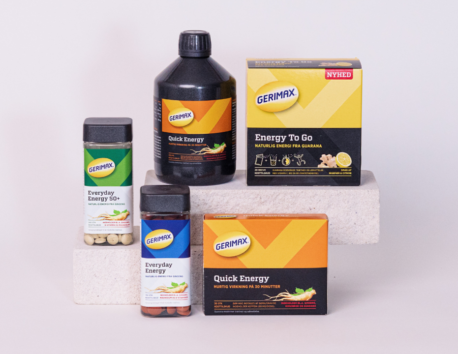 Er du i en periode ekstra træt og har behov for en god præstationsevne? Så kan Gerimax være din hjælp! Med Gerimax® får du kosttilskud med ingredienser, som hjælper dig med energien. Fx indeholder Gerimax Everyday Energy, ginseng, der hjælper med at modvirke træthed og vedligeholde fysisk og mental præstationsevne i perioder med lavt energiniveau, udmattelse, træthed og tab af koncentration.